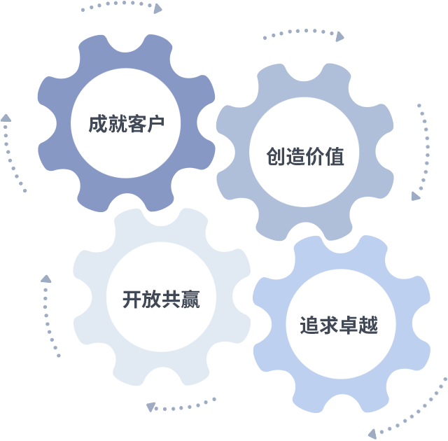 成就客户是一切决策的出发点,,,,创造价值是衡量所有工作的标准,,追求卓越是我们做事做人的态度,,,开放共赢是我们的格局也是最终的结果。。。价值观的齿轮环环相扣,,,推动着组织里的每个人不断向前。。。